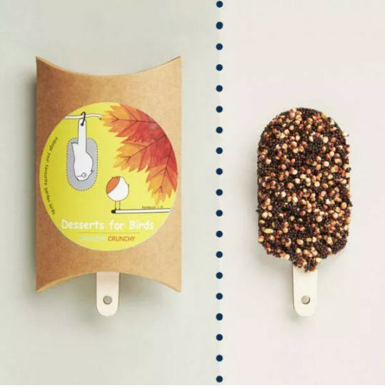 Leuke verrassing: nadat de vogels het toetje met smaak hebben verorberd, komt er een origineel lasergesneden ijsstokje tevoorschijn, in de vorm van een roodborstje, een koolmeesje of een halsbandparkietje.