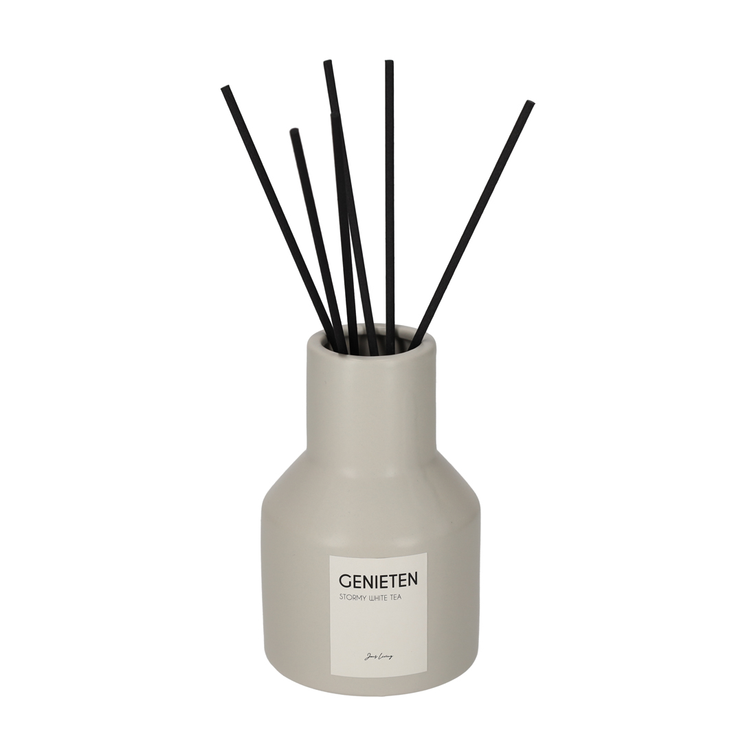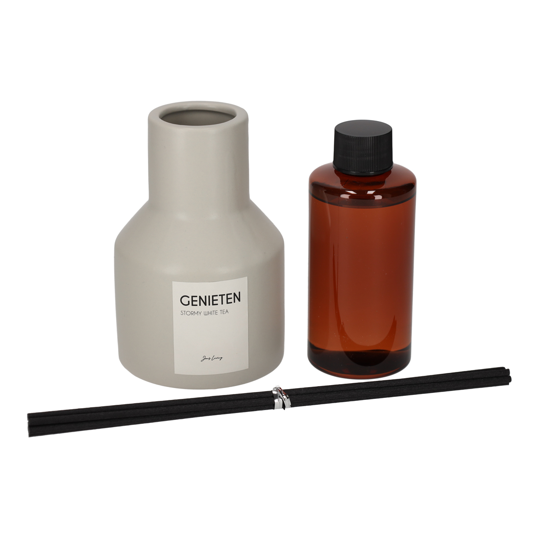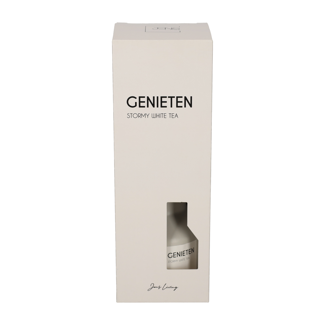 Breng een fijne sfeer in huis met deze luxe geurstokjes. De verfijnde geur van witte thee is perfect is voor elke gelegenheid. Met de quote ‘Genieten’ brengt de diffuser een speelse touch in je interieur. Wil je de geurintensiteit versterken? Draai de stokjes eenvoudig om voor een extra boost.