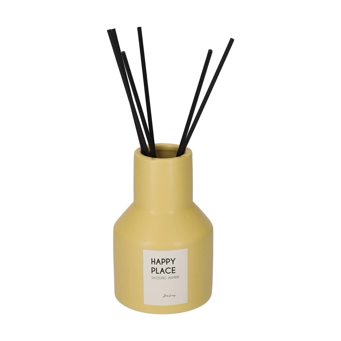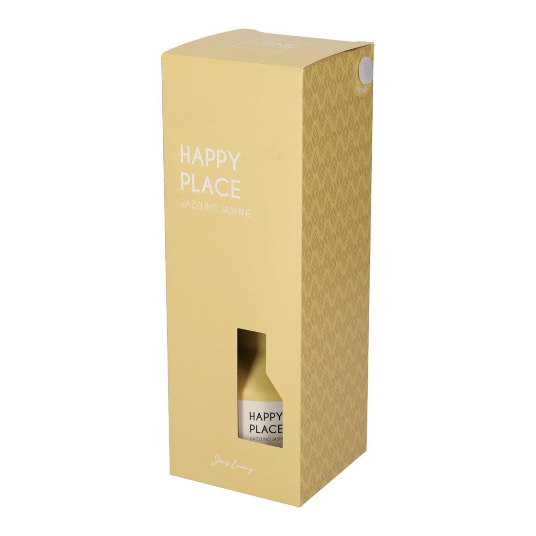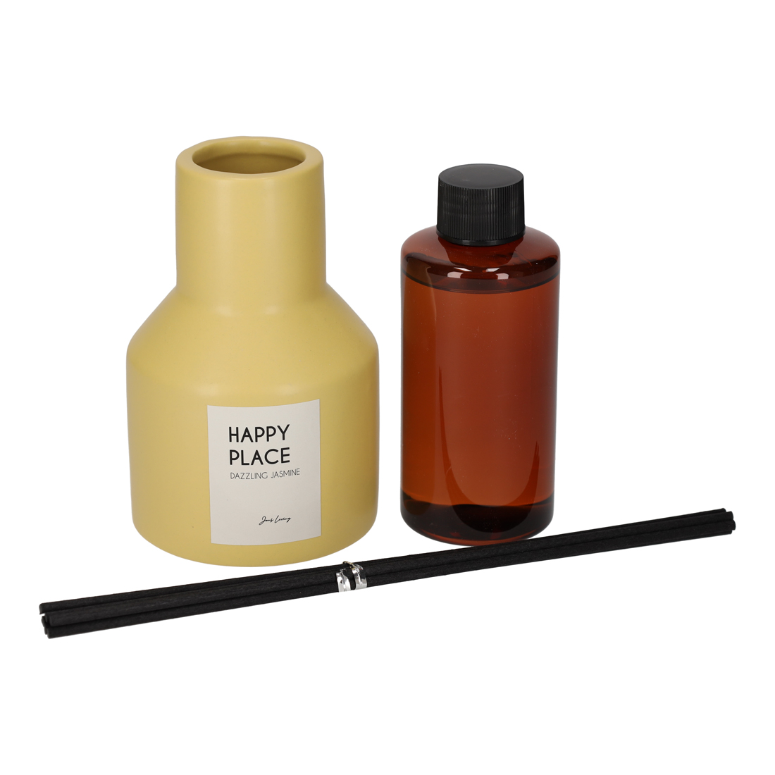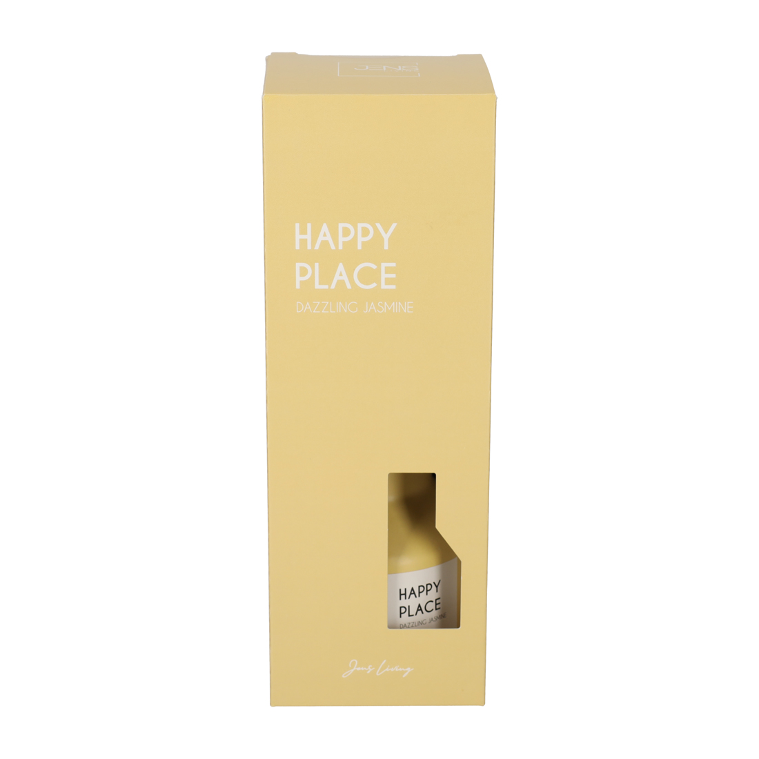 Breng een fijne sfeer in huis met deze luxe geurstokjes. De bloemige jasmijngeur is perfect is voor elke gelegenheid. Met de quote ‘Happy place’ brengt de diffuser een speelse touch in je interieur. Wil je de geurintensiteit versterken? Draai de stokjes eenvoudig om voor een extra boost.