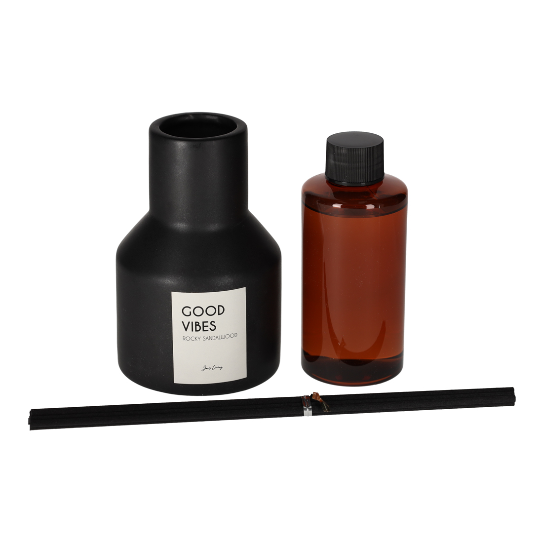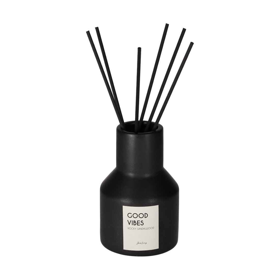Breng een fijne sfeer in huis met deze luxe geurstokjes. De sandalwoodgeur zorgt voor een warme, houtachtige geur die perfect past in elke ruimte. Met de quote ‘Good vibes’ brengt de diffuser een speelse touch in je interieur. Wil je de geurintensiteit versterken? Draai de stokjes eenvoudig om voor een extra boost.