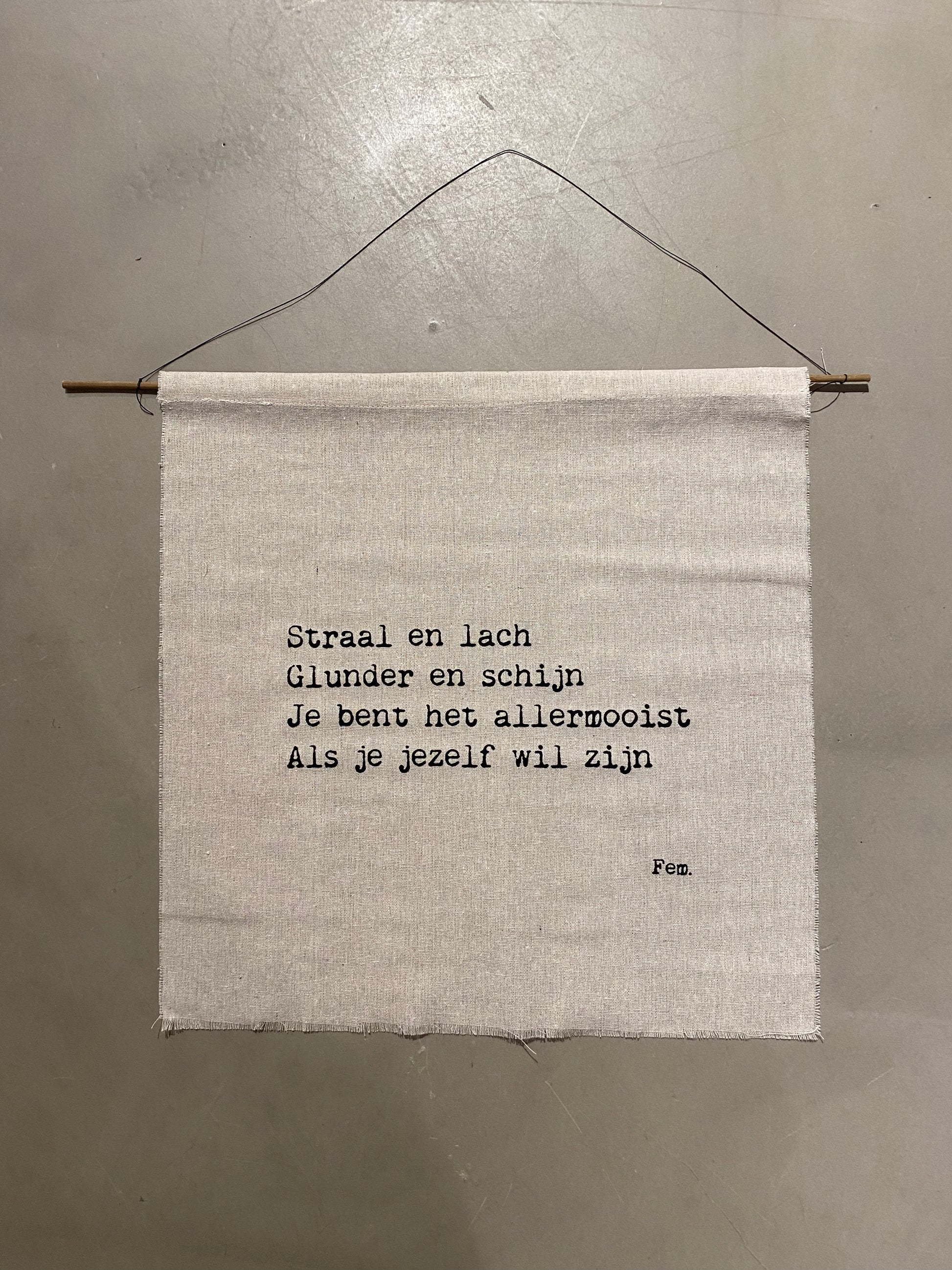 Maak je ruimte leuker door deze wanddoek van Papierpleziertjes op te hangen. Een babytekst voor de kinderkamer of een feel good tekst voor in de woonkamer…deze wanddoek past overal dankzij de neutrale kleur met zwarte tekst. Je kunt de wanddoek ophangen dankzij de bamboestok en het zwarte koord welke mee wordt geleverd.